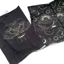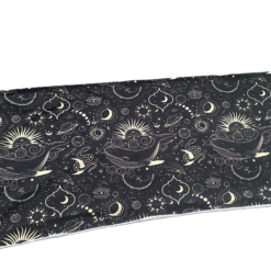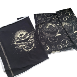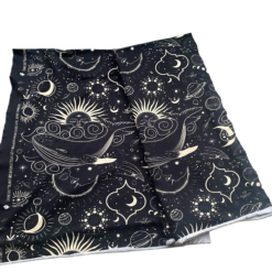 Meterware Cosmic Motive auf schwarzem Stoff. Ab 0,5 Meter bestellbar.