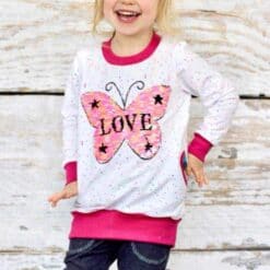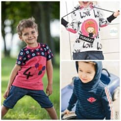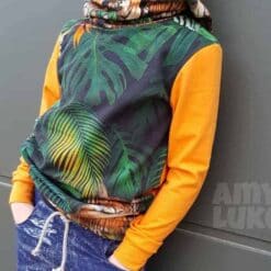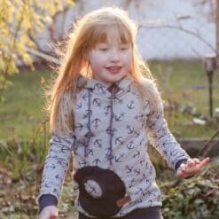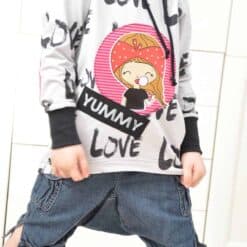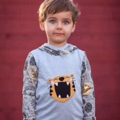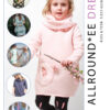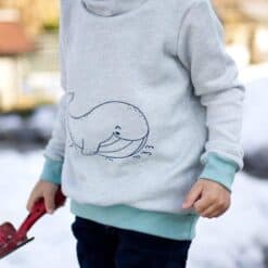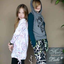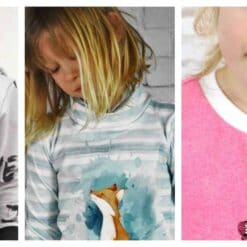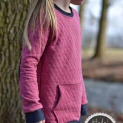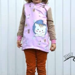 Der Allround*ee ist ein Lang-/Kurzarm-Top, das sich jeder Wetterlage anpasst. Er ist echt ein Alleskönner; mit 4 verschiedenen Taschenoptionen versehen- die einmalige Rundtasche (Jenny’s Circlepocket), ein Känguru Tasche, seitliche Eingriffstaschen und versteckte seitliche Eingriffstaschen. Zudem kann man entweder eine überkreuzte Kapuze, einen schmalen Stehkragen, sowie einen wunderschönen Schlauchkragen für Mädchen, einen coolen Sportkragen oder auch einfach ein Kragenbündchen annähen. Der Allround*ee ist in Grössen 62/68 bis 170/176 gradiert, man kann ihn entweder in gerader Form oder im VoKuHiLa-Style nähen. Eine hübsche Unterteilung des Vorderteils sorgt zudem auch für einen besonderen Hingucker. Ausgelegt ist der Schnitt auf leichtem Sommersweat, geht aber auch wunderbar aus Jersey!