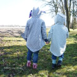 Im Schnittbild sind auch Öhrchen enthalten, die entweder als Hundeohnren seitlich oder Hasenohren ins Bündchen genäht werden. Mit aufgesetzten Taschen und 3 Kapuzenoptionen, wird es sicher ein Schnitt, den man immer wieder nähen mag.