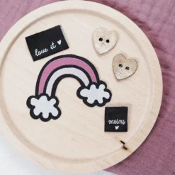 Verarbeitung: Die Oberkante ist offen. Das Label wird zwischen 2 Stofflagen z.B. am Kragen, unter Applikationen, am Saum,… eingenäht.