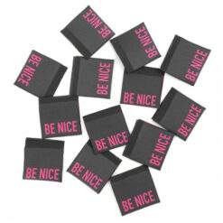 1 tolles gewebtes Label mit Mittelfaltung zum in die Naht Einnähen! Hier ein graues Label mit „be nice“ Schriftzug in pink.