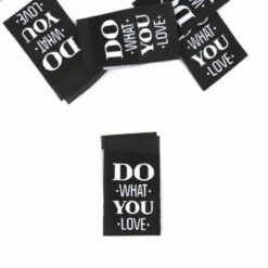 1 tolles gewebtes Label mit Mittelfaltung zum in die Naht Einnähen! Hier ein schwarzes Label mit „DO WHAT YOU LOVE“ Schriftzug in Weiß.