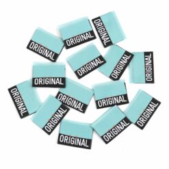Hier ein pastelltürkisfarbenes Label mit dem Schriftzug „ORIGINAL“ in Weiß, der schwarz hinterlegt ist.