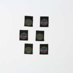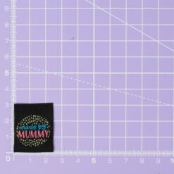 ‚Made by Mummy‘ woven in a bright blue and coral thread with a black and yellow background.
